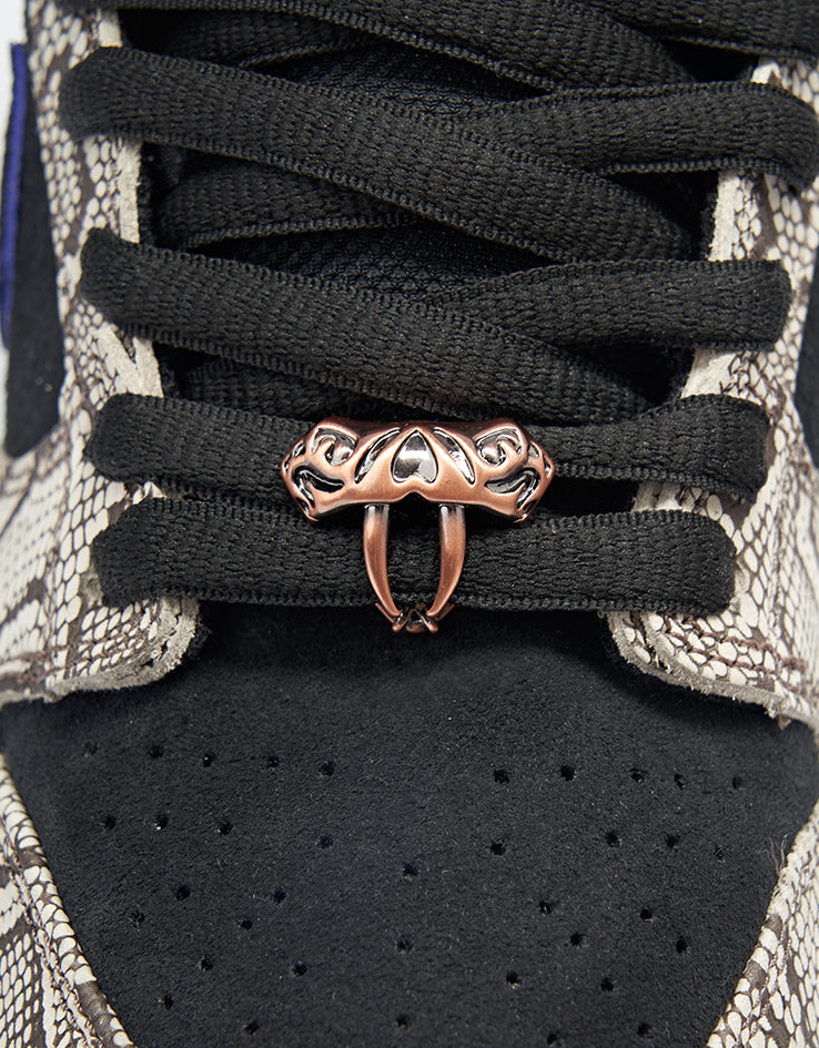 The references to the 2001 World Series champions don’t stop there, though, with the team’s iconic colour palette seen dotted around the shoes, including on the tongue, heel and lining. Adding to the thoughtful details on his homage to the AZ, a diamond-shaped snake sits on the inside tongue, and Dashawn Jordan-branded insoles with coiled snake graphics sit inside the shoe. The crowning detail of this already banging effort, an intricate fanged copper dubrae on the lower laces of each shoe.